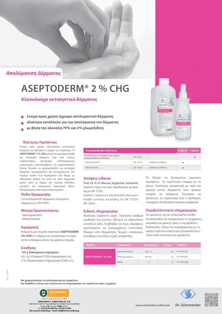 Το Aseptoderm 2% CHG μπορεί ναν χρησιμοποιηθεί για αντισηψία δέρματος πρίν από ενέσεις, παρακεντήσεις, αιμοληψίες, καθετηριασμούς, χειρουργικές μικροεπεμβάσεις και μικροτραύματα.