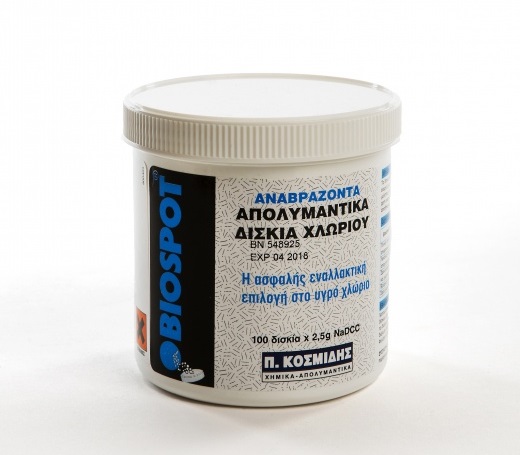 Τα αναβράζοντα δισκία διχλωροϊσοκυανουρικού νατρίου 2,5gr BIOSPOT είναι εγκεκριμένα από τον Ε.Ο.Φ. ως απολυμαντικά επιφανειών, έχουν ως βασικό συστατικό το διχλωροϊσοκυανουρικό νάτριο (NaDCC), μία χημική ένωση χλωρίου σε στερεή μορφή που αναμιγνύεται με αναβράζοντα και σταθεροποιητικά συστατικά προτού συμπιεστεί σε μορφή ταμπλέτας.