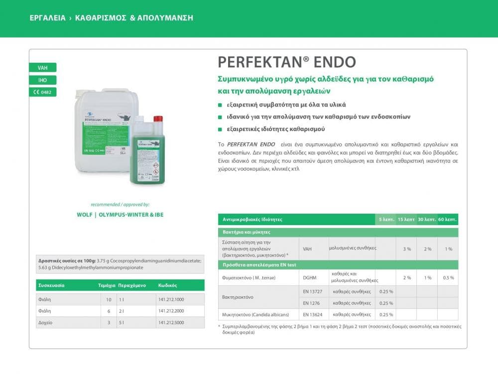 Το Perfektan endo είναι ένα συμπυκνωμένο απολυμαντικό και καθαριστικό εργαλείων και ενδοσκοπίων.