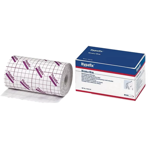 Αυτοκόλλητη αραχνούφαντη (non-woven) ταινία Hypafix 15x10cm για στήριξη γαζών, εργαλείων και καθετήρων. Κόβεται εύκολα με ένα ψαλίδι στην διάσταση που χρειάζεται