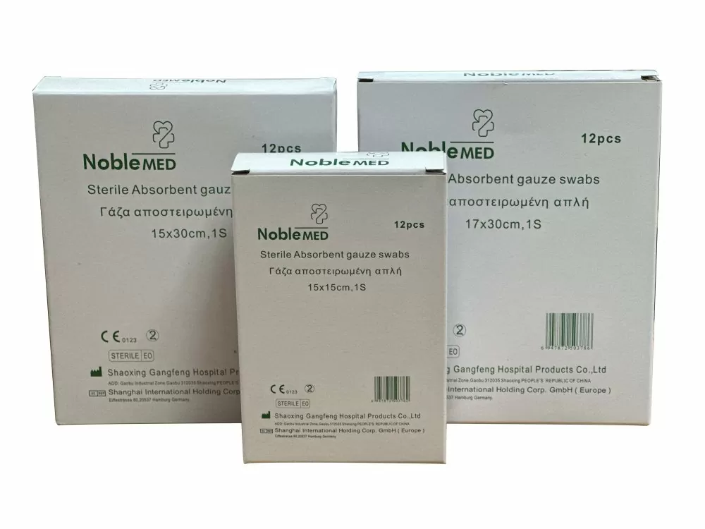 Γάζες αποστειρωμένες Noblemed , κατάλληλες για πλήθος εφαρμογών από την γενική περιποίηση τραυμάτων ως τολύπιο σε μικρές επεμβάσεις.