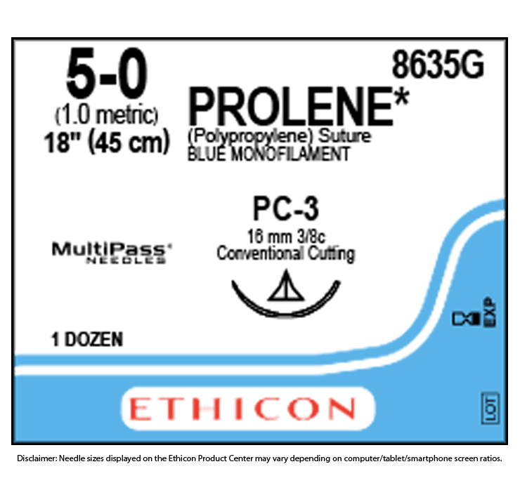 Συνθετικό ράμμα Prolene 5/0 μη απορροφήσιμο σχεδιασμένο να παρέχει παρατεταμένη αντοχή στην τάση.