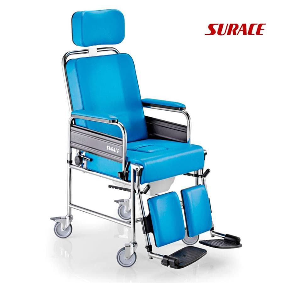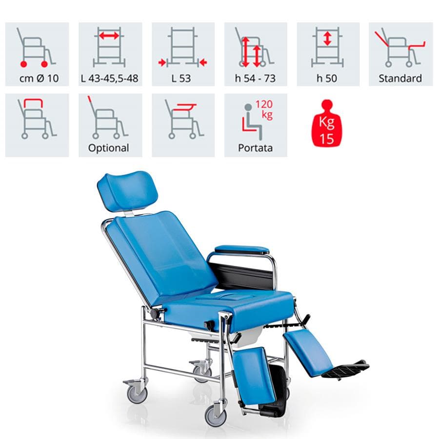 Αναπηρική πολυθρόνα με WC, προσθαφαιρούμενα μπράτσα, ανατομική κατασκευή ταπετσαρίας, ρυθμιζόμενα ανακλινόμενα υποπόδια, ανακλινόμενη πλάτη, φρένα.