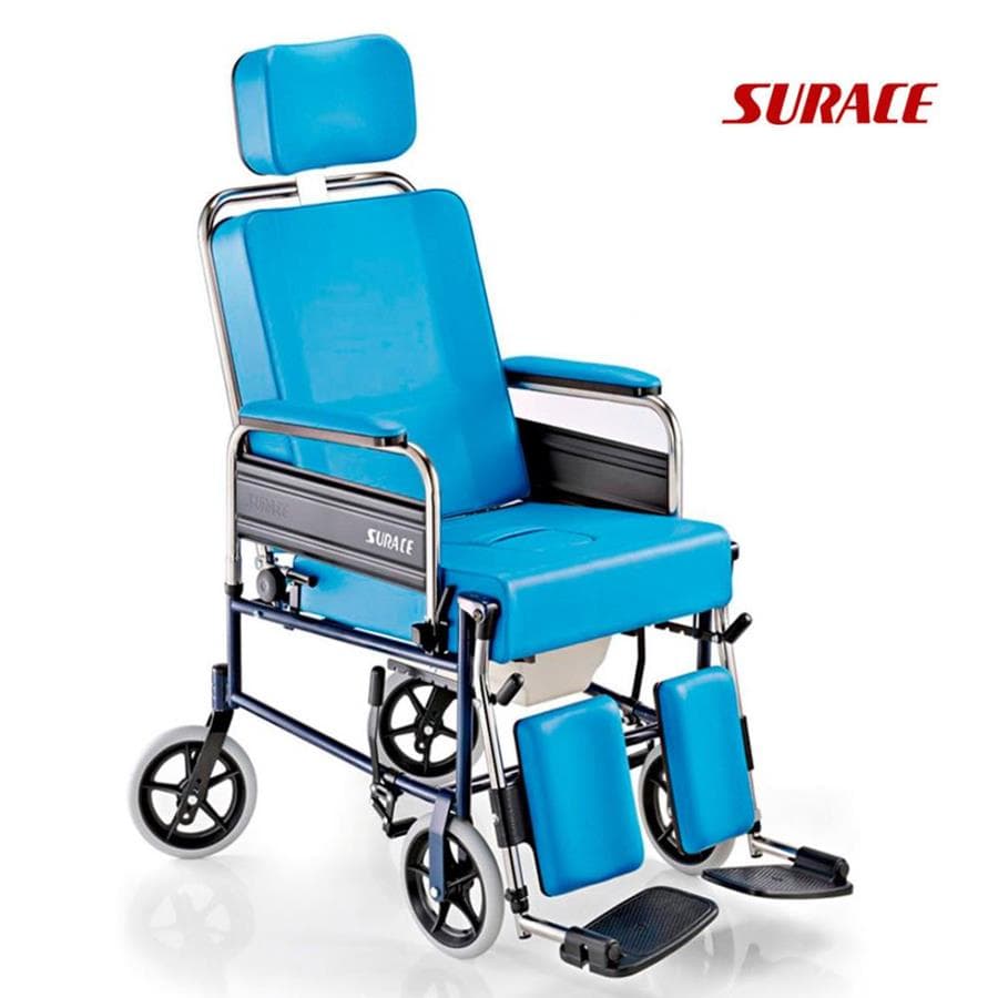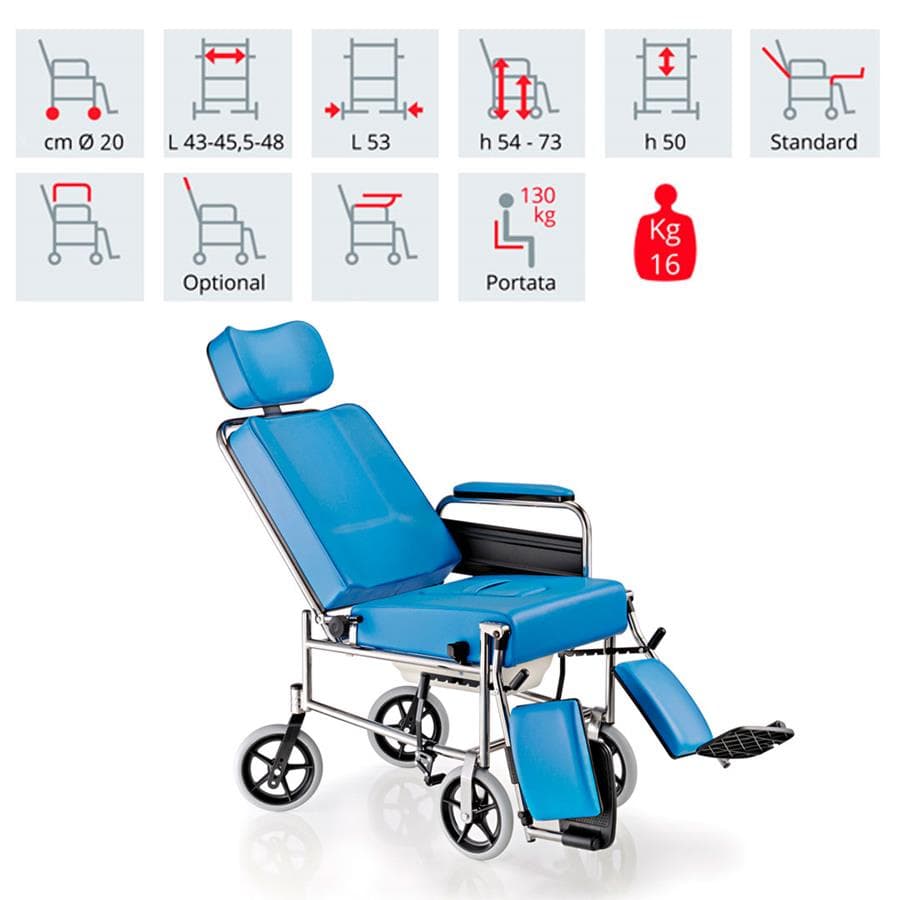 Αναπηρική πολυθρόνα με WC, προσθαφαιρούμενα μπράτσα, ανατομική κατασκευή ταπετσαρίας, ρυθμιζόμενα ανακλινόμενα υποπόδια, ανακλινόμενη πλάτη, προσθαφαιρούμενα μπράτσα, φρένα, συμπαγείς ρόδες.