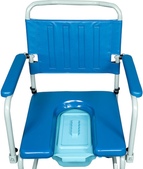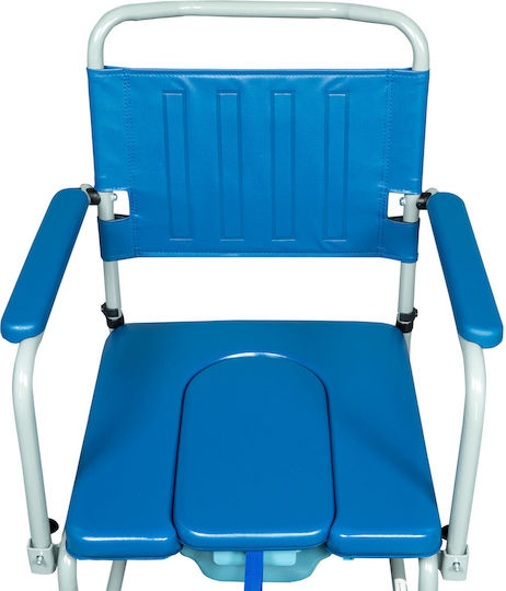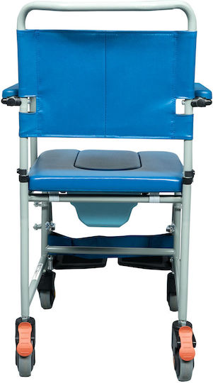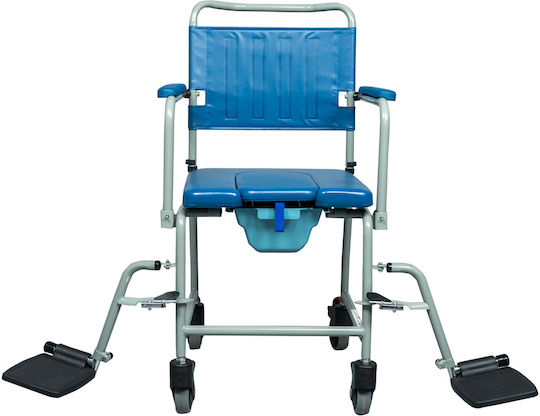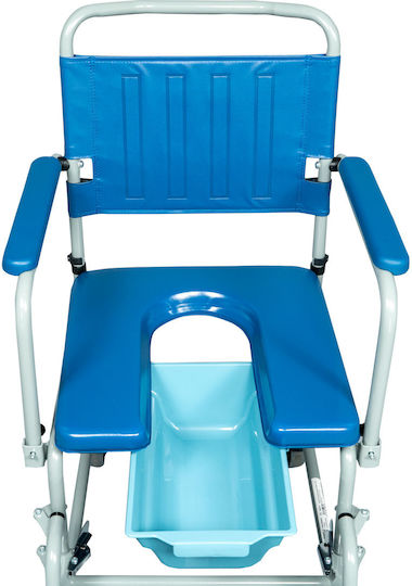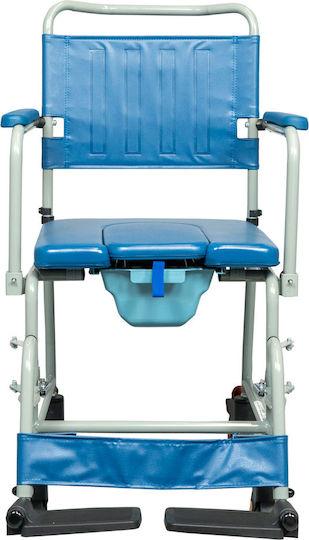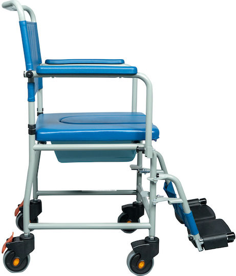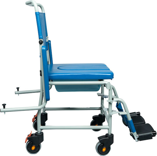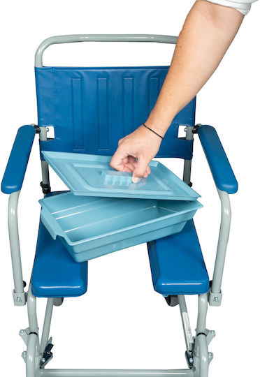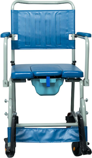 Χειροκίνητο αναπηρικό αμαξίδιο μπάνιου της εταιρείας Mobiak σε μπλε χρώμα. Διαθέτει μικρούς τροχούς, διευκολύνοντας τα άτομα με κινητικά προβλήματα ή αναπηρία στη μετακίνηση και τη χρήση του μπάνιου με τη βοήθεια συνοδού.