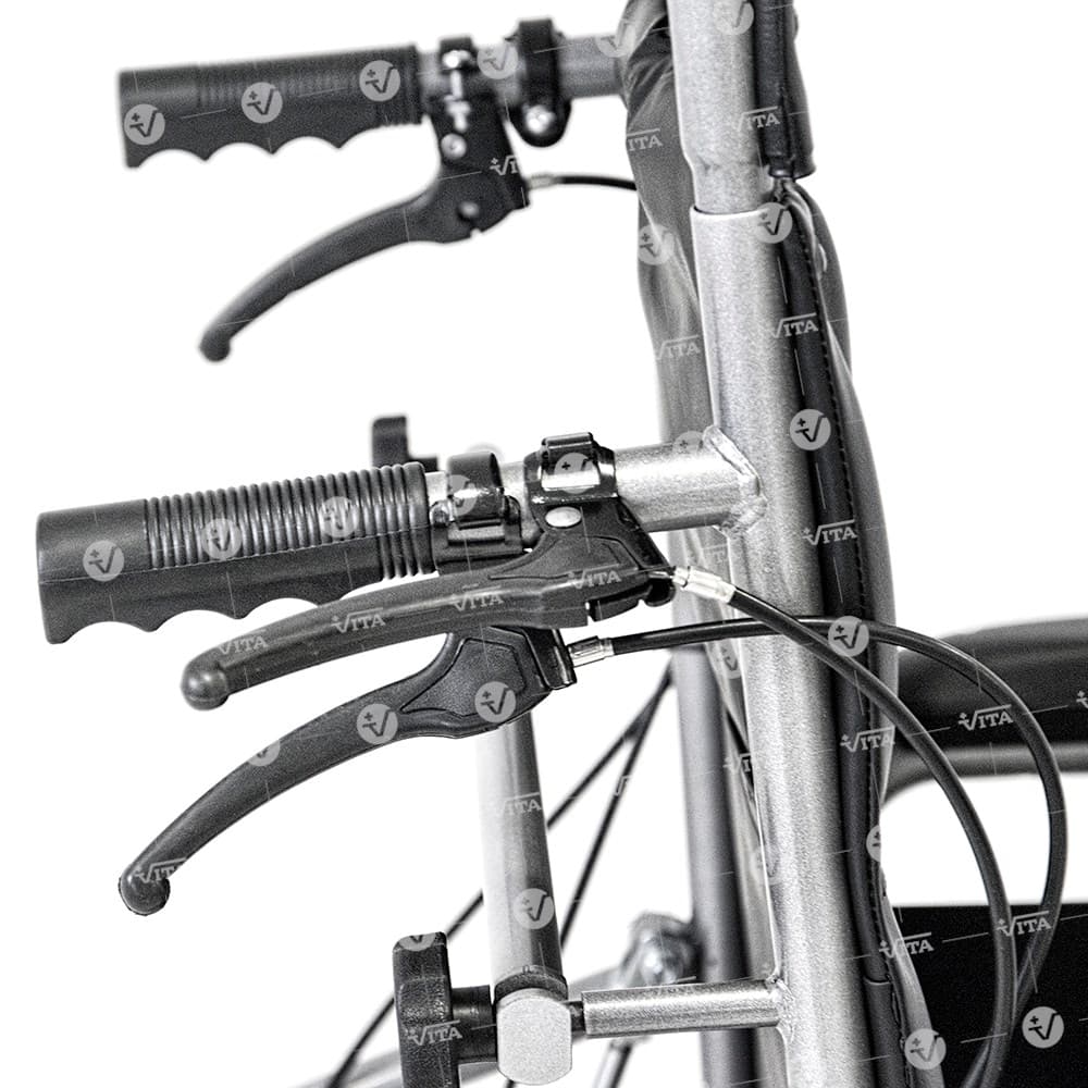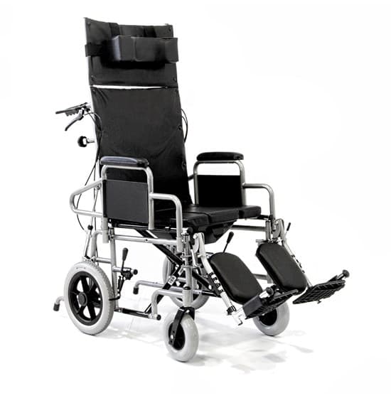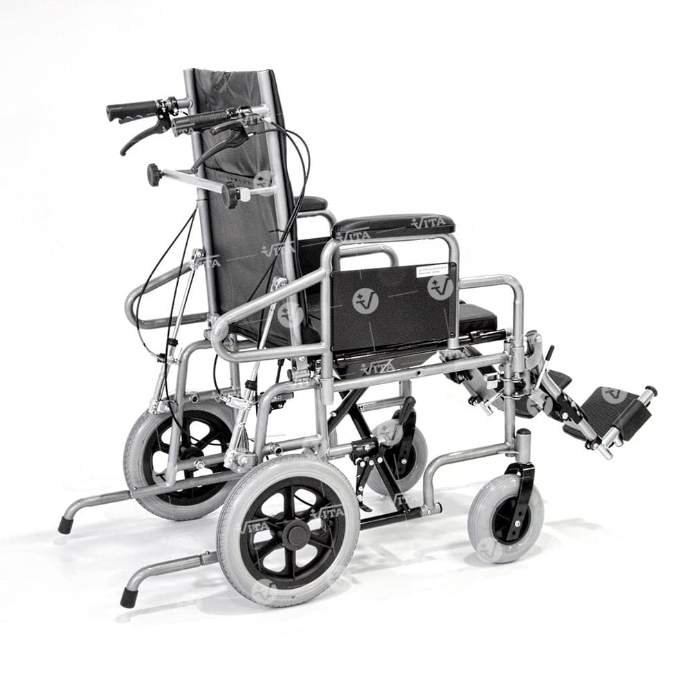 Αναπηρικό αµαξίδιο µεταφοράς πτυσσόµενο, µε δοχείο WC και προσθαφαιρούµενο κάλυµµα οπής. Κατασκευή από µεταλλικό σκελετό ακρυλικής βαφής. Αφαιρούµενα πλαϊνά στήριξης, αφαιρούµενα και ανακλινόµενα υποπόδια µε µαξιλαράκια ανάπαυσης. Υψηλή ανακλινόµενη πλάτη, ρυθµιζόµενη σε θέσεις επιλογής µε προσθαφαιρούµενη προέκταση και αυτοκόλλητο µαξιλάρι. Eπένδυση πλάτης και καθίσµατος από µαλακή ταπετσαρία. Φέρει φρένα συνοδού και ζώνη ασφαλείας.