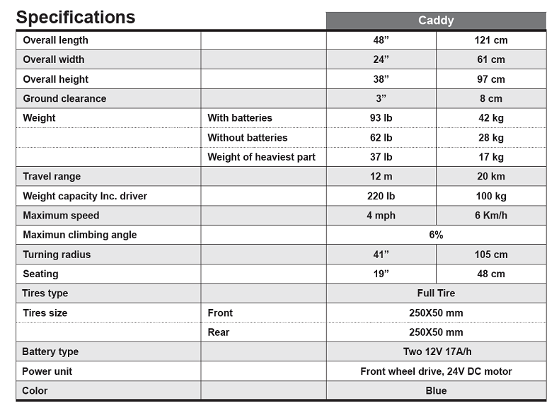 Το Caddy επιτρέπει την εύκολη αποθήκευση στο σπίτι, την μεταφορά του σε πορτ-μπαγκάζ του αυτοκινήτου ή ακόμα και με το αεροπλάνο.