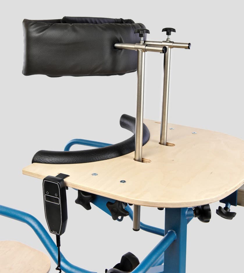 Το κάθισμα του ορθοστάτη χρησιμεύει επίσης ως στήριξη που διατηρεί τον ασθενή στη σωστή θέση και τον ασφαλίζει.