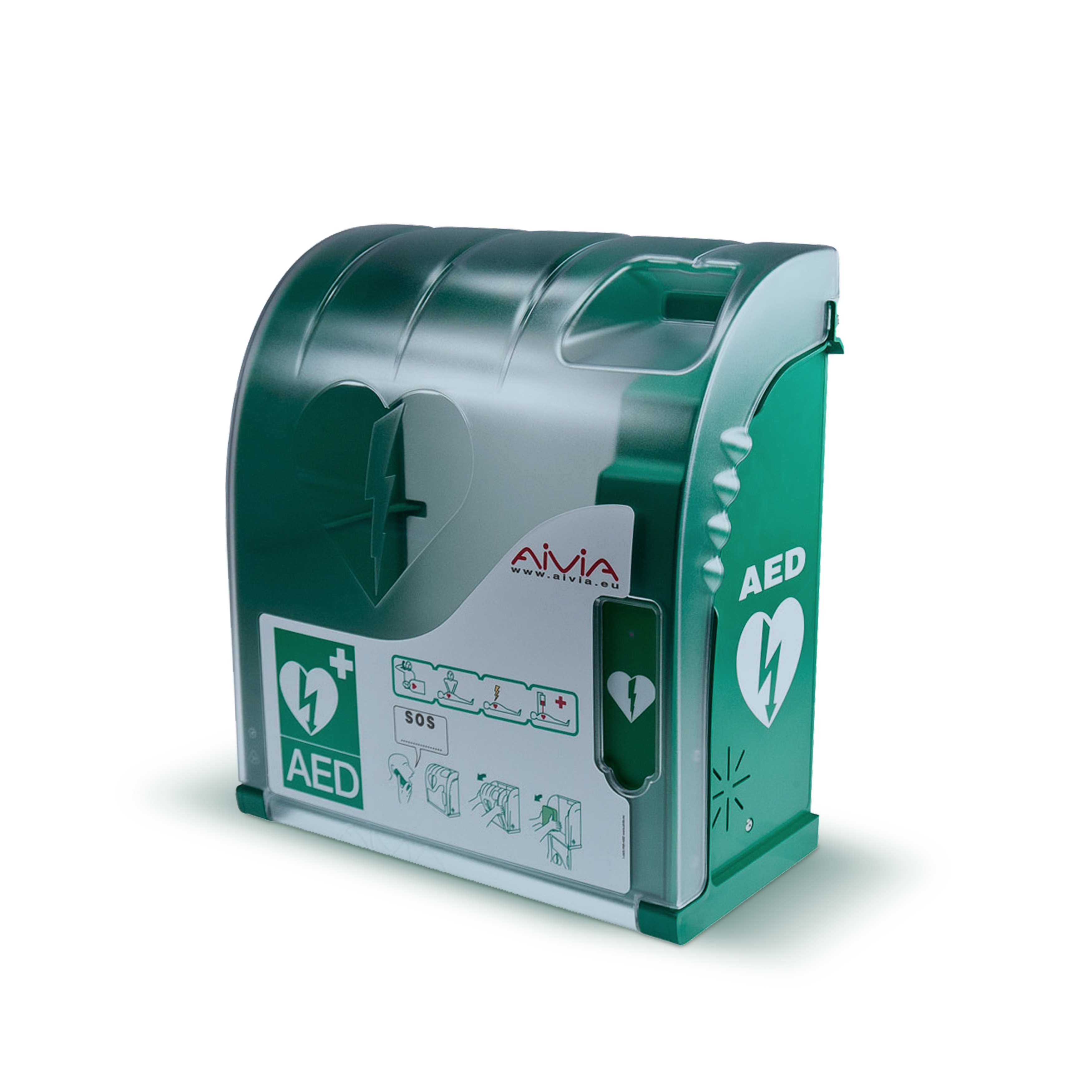 Το κουτί ασφαλείας απινιδωτή Aivia 200 AED, η οποία προστατεύεται με ηχητικό συναγερμό καθώς και θέρμανση (προστασία του AED από ψύχος), παρέχει την τέλεια εσωτερική ή εξωτερική λύση στην προστασία του AED σας.
