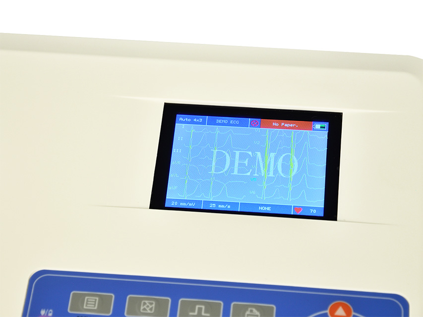 - Ησυσκευή καταγράφει ευκρινώς και με ακρίβεια σε πραγματικό χρόνο κυματομορφή ΗΚΓ 3 καναλιών με παράλληλες επισημάνσεις (αριθμός απαγωγής, ευαισθησία, ταχύτητα χαρτιού, κατάσταση φίλτρου κλπ).