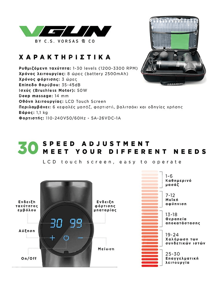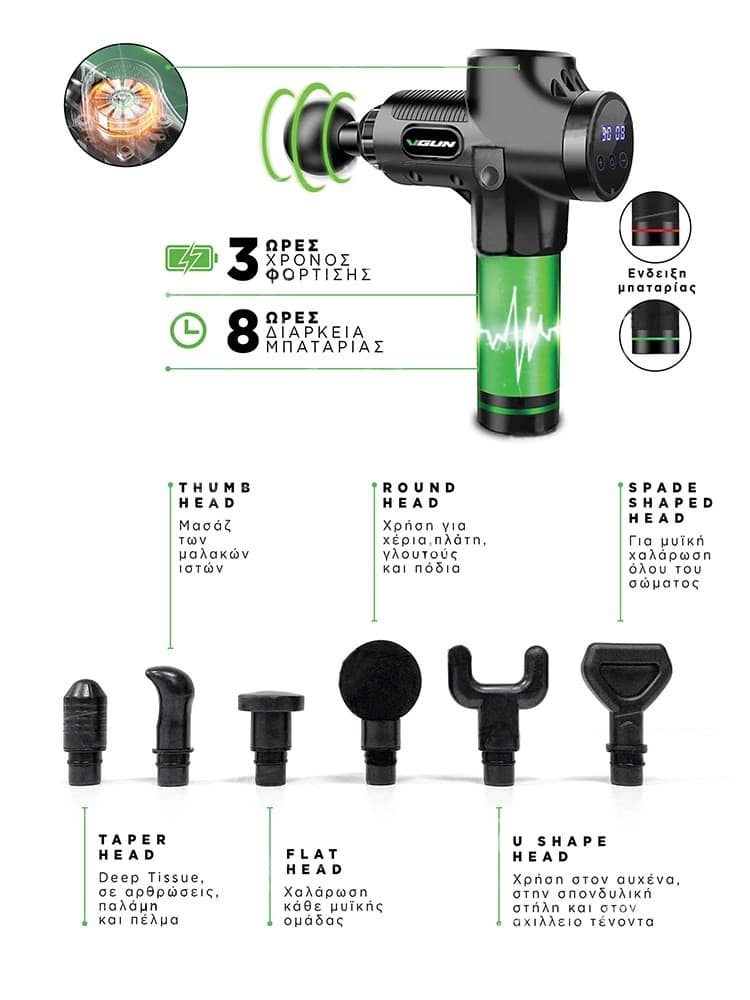 Η συσκευή "VGUN" λειτουργεί με επαναφορτιζόμενη μπαταρία λιθίου και φέρει 6 διαφορετικές κεφαλές για το καλύτερο δυνατό αποτέλεσμα ανάκαμψης των μυών.