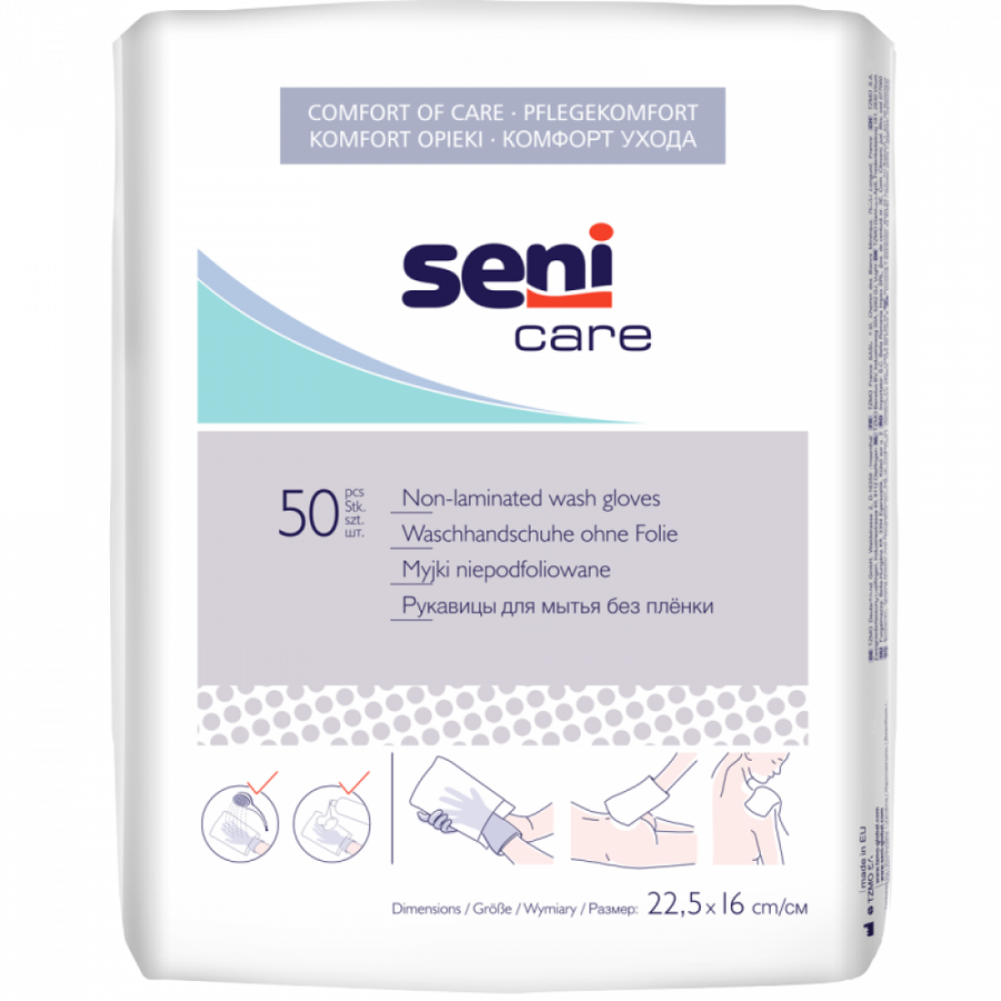 Τα μη μεμβρανώδη υγιεινολογικά γάντια Seni Care χρησιμοποιούνται για το πλύσιμο και τη φροντίδα του δέρματος του ασθενούς, ενώ παράλληλα προστατεύουν τα χέρια του φροντιστή. Παρέχουν άνεση και ευκολία στη φροντίδα κατά τη διάρκεια των καθημερινών δραστηριοτήτων υγιεινής. Συνιστώνται για τους φροντιστές εξαρτημένων ατόμων κατά τον καθαρισμό του δέρματος του ασθενούς με προϊόντα καθαρισμού με χρήση νερού .