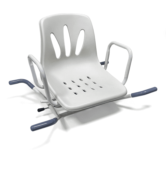 Κατασκευή από επιχρωµιωµένο µεταλλικό σκελετό. Ανετο πλαστικό κάθισµα µε οπές εύκολης διαφυγής του νερού. Πλαϊνά στηρίγµατα ασφαλείας ώστε να διευκολύνεται ο χρήστης κατά την είσοδο και έξοδο στη µπανιέρα. Μεταλλικός µοχλός ρύθµισης της περιστροφής του καθίσµατος.